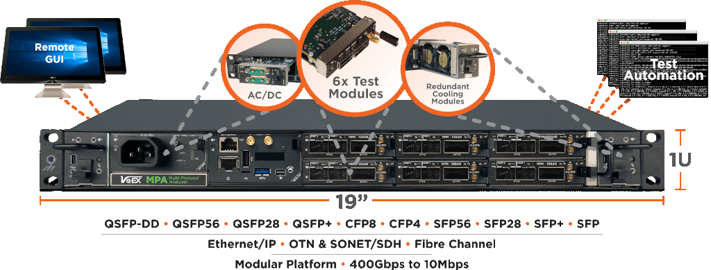 Máy đo viễn thông VeEX MPA hỗ trợ đo kiểm nhiều công nghệ khác nhau, từ mạng truy nhập tới mạng trục với tốc độ lên tới 400G/600G, bao gồm : eCPRI, CPRI/OBSAI, OTN, SDH/SONET, PDH/DSn, Carrier Ethernet, SyncE, 1588v2 PTP, Fibre Channel, SFP/CFP/QSFP, OSA. Người dùng thực hiện các thao tác điều khiển, đọc kết quả đo, cài đặt cấu hình phép đo trên phần mềm chuyên dụng cài trên máy tính PC tương thích Windows, có thể sử dụng cục bộ trên mạng LAN hoặc từ xa qua mạng Internet.