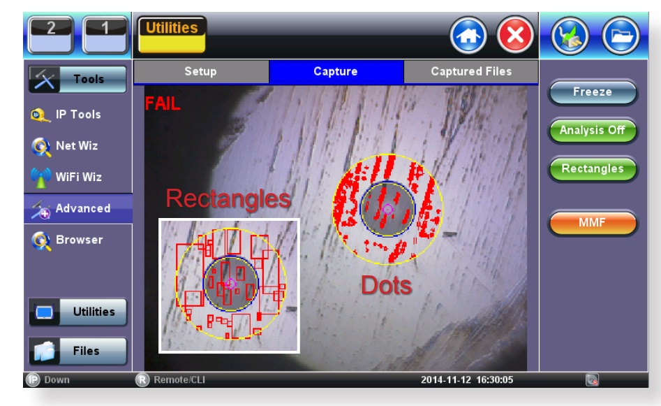 The test set detects when the image has reached optimal focus level, automatically freezes the picture, captures the image and runs the IEC 61300-3-35 analysis